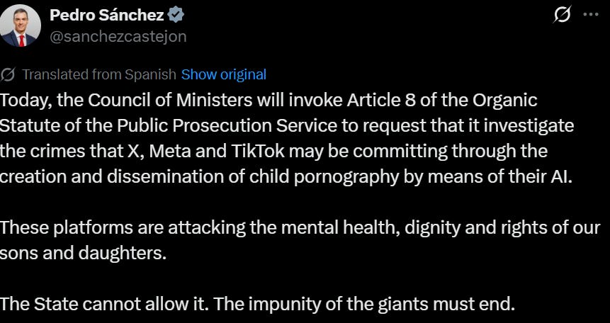 So when Pedro Sanchez walked out this morning and announced that Spain’s Council of Ministers would invoke Article 8 of the Organic Statute of the Public Prosecution Service — sic prosecutors onto X, Meta and TikTok for “crimes they may be committing” through AI-generated child pornography — understand what you’re looking at.
